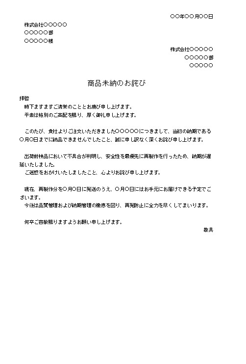 このたび、貴社よりご注文いただきました○○○○○につきまして、当初の納期である○月○日までに納品できませんでしたこと、誠に申し訳なく深くお詫び申し上げます。