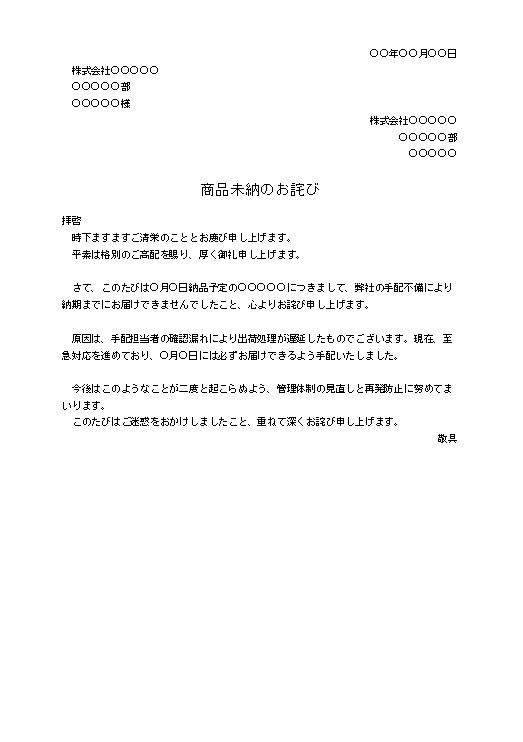 さて、このたびは○月○日納品予定の○○○○○につきまして、弊社の手配不備により納期までにお届けできませんでしたこと、心よりお詫び申し上げます。