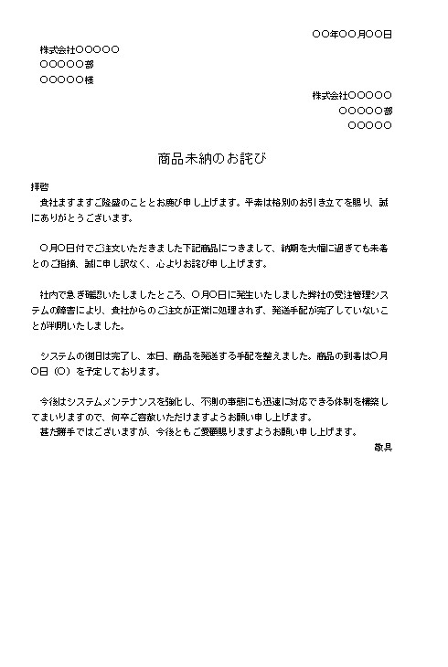 システムの復旧は完了し、本日、商品を発送する手配を整えました。商品の到着は○月○日(○)を予定しております。